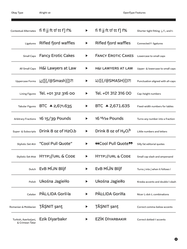Alright is an OpenType font with advanced typographic features like Small Caps and alternate figure styles. These features make it easy to typeset nice looking blocks of text. Click each preview to toggle the feature on/off. Get more detailed information by clicking the (?) icon in the corner.